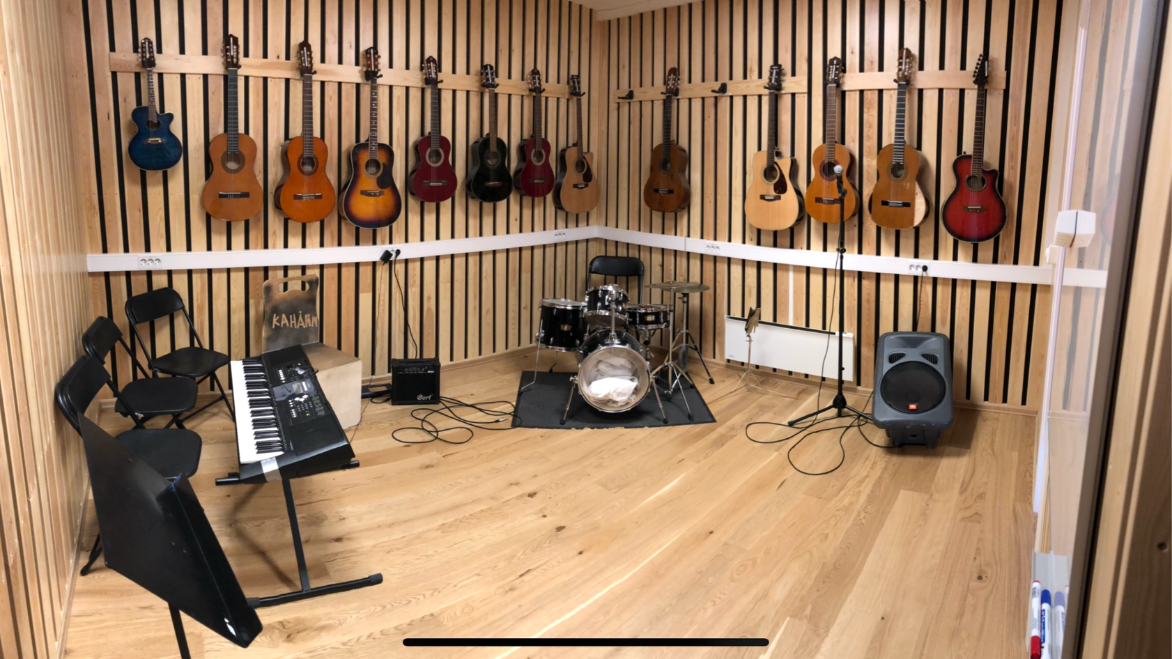Alle trinn får 60 min musikkundervisning per uke, to lærere per klasse (med unntak for 10.trinn 24/25), et kjempestort musikkrom (tidligere svømmehall) med projektor og stort lerret, flygel, piano og lydanlegg. I tillegg disponerer de fire lydisolerte øveceller med instrumenter (tidligere dusj og garderober) og plass til 7-8 elever per rom.