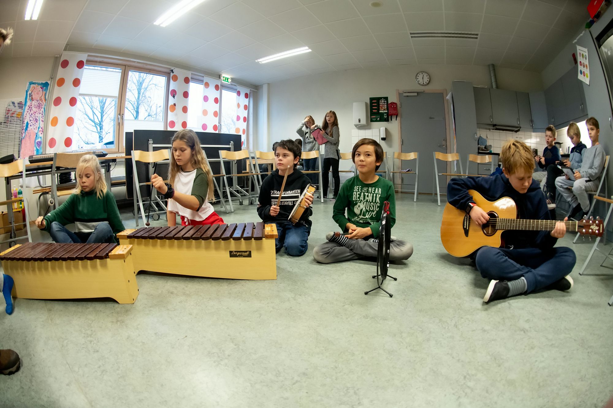 Elevene ved Torvbråten skole synger og danser, og alle får prøve seg på ulike instrumenter som gitar, ukulele, keyboard, bass og trommer.